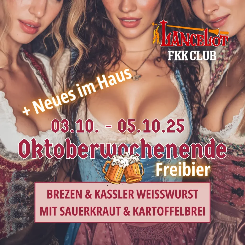 O’zapft is im FKK Club Lancelot! Vom 03.10. – 05.10.25 feiern wir ein unvergessliches Oktoberwochenende, mit allem, was dazugehört: Freibier Brezen & Kassler Weißwurst mit Sauerkraut & Kartoffelbrei Und dazu: Neues im Haus Industriestraße 4a, 77656 Offenburg Save the Date & bring deine Feierlaune mit! #oktoberfest#clublancelot#oktoberfest#freibier#party#Offenburg